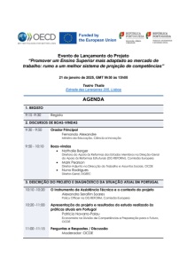 Evento de Lançamento do Projeto “Promover um Ensino Superior mais adaptado ao mercado de trabalho: rumo a um melhor sistema de projeção de competências” 21 de janeiro de 2025, GMT 9h30 às 13h05 Teatro Thalia Estrada das Laranjeiras 205, Lisboa AGENDA 1. REGISTO 9:15 -9:30 Registo 2. DISCURSOS DE BOAS-VINDAS 9:30 - 9:50 Orador Principal Fernando Alexandre Ministro da Educação, Ciência e Inovação 9:50 - 10:10 Boas-vindas • Nathalie Berger Diretora do Apoio às Reformas dos Estados Membros na Direção-Geral do Apoio às Reformas Estruturais (DG REFORM), Comissão Europeia • Mark Pearson Diretor-Adjunto na Direcção do Trabalho e Assuntos Sociais, OCDE • Nuno Rodrigues Diretor-Geral, DGEEC 3. DESCRIÇÃO DO PROJETO E DIAGNÓSTICO DA SITUAÇÃO ATUAL EM PORTUGAL 10:10 -10:20 O Instrumento de Assistência Técnica e o contexto do projeto Alexandra Serafim Soares Policy Officer na DG REFORM, Comissão Europeia 10:20 -11:00 Apresentação do projeto e resultados do estudo realizado às práticas atuais em Portugal Patricia Navarro-Palau Economista na Divisão de Competências e Preparação para o Futuro, OCDE 11:00 -11:15 Perguntas e Respostas / Discussão Moderador: OCDE